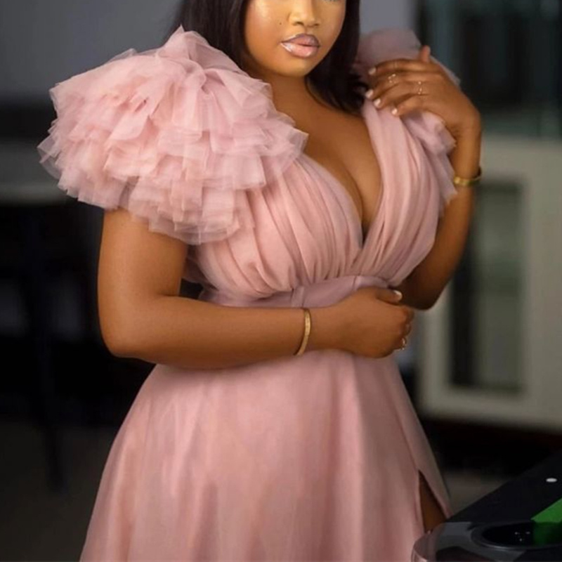 1.Deep V neck dress with padded breasts.Pleated top and large flowers on the shoulders. The hem is a split style, composed of tulle and a layer of inner lining for a sexy, elegant look.